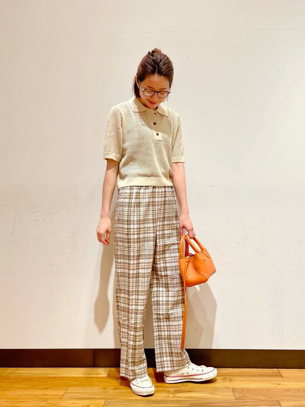 プレッピースタイルを意識した、カジュアルコーデです! ビタミンカラーでもある、びびっとのオレンジ色のバックがコーデの差し色に◎