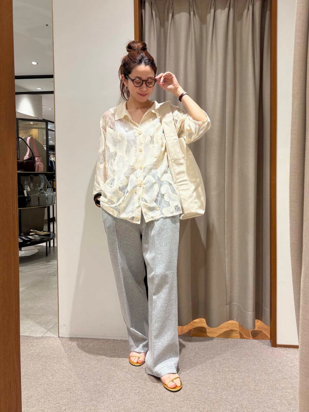 【167cmコメント】 ・シャツ サラッとした素材で、サイズもゆとりがあります。 珍しいレースの柄がはいっているので、 インナーの透け感はさほど気にならなかったです。 ネットは完売していますが、まだ店舗には在庫ございます! ・パンツ フリーサイズなので ウエスト、お尻周りは余裕があるサイズ感です。 ゆるっとしていて楽ですが 程よいセミフレアのシルエットなので 大人が履けるスウェットパンツになっています。 何か商品で気になることがあればお気軽に下記へ お問い合わせください!😊 岡本インスタ @ai_okmt14 URなんばCITY店 050-2017-9044