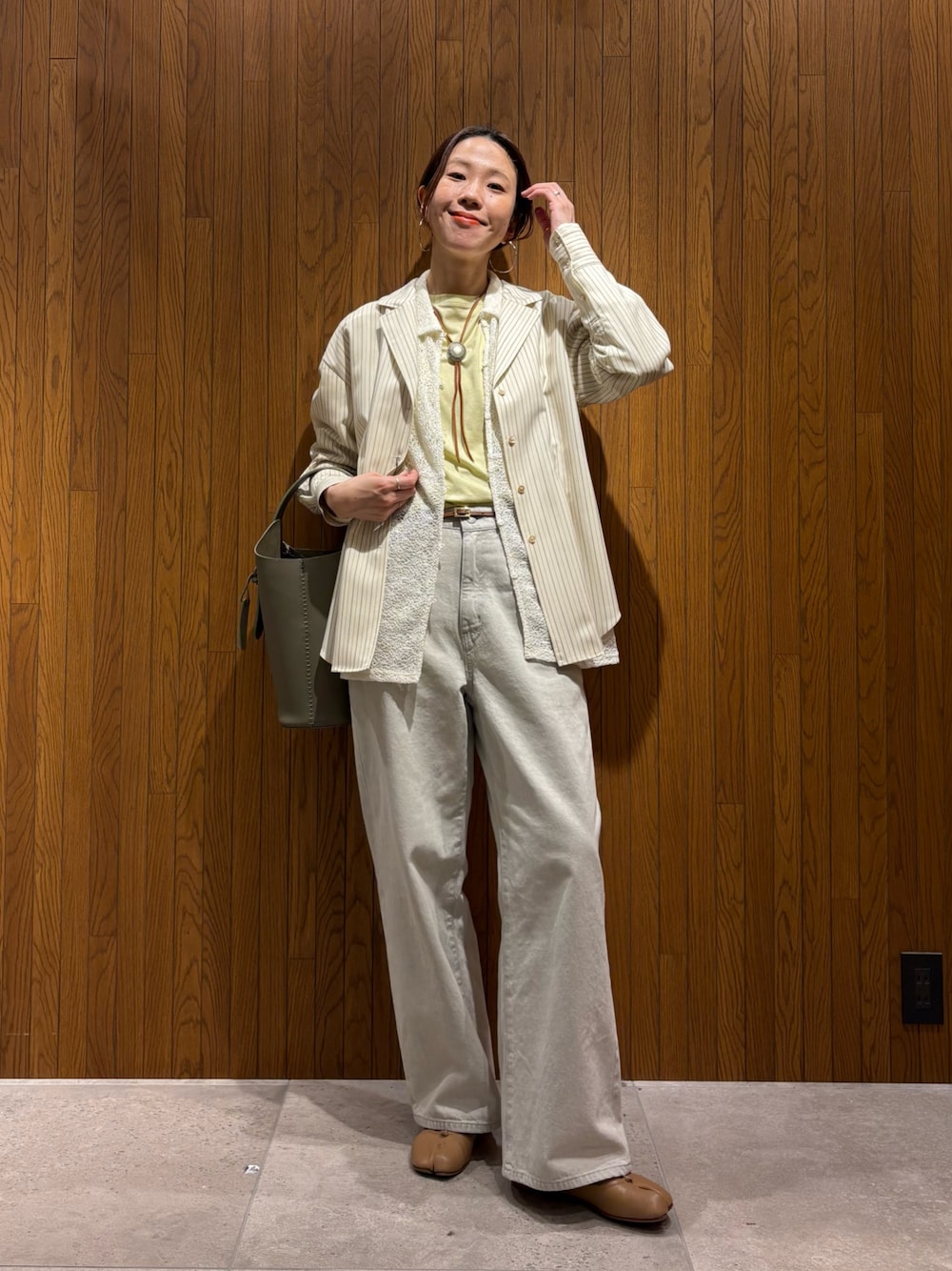身長:167cm 年齢:30台後半 骨格ナチュラル/ イエベ秋 【167cmコメント】 ・外側に着たストライプシャツ ジャケットのような雰囲気のあるシャツで スタッフ人気の高い一着です。 ウエストがシェイプされていたり 袖口がきゅっとしまっているデザインなので 女性らしさが出ます。 ・中にきたレースのシャツ ゆるっとしたサイズ感と 柔らかい素材で着心地がいいです。 メロンレースという普通のレースもは異なった編み地になっていて甘くなり過ぎないです。 *黄色のインナーとネックレスとシューズ以外 お店で取り扱いしております! 何か気になることがあれば下記へ お気軽にお問合せください😊 岡本インスタ @ai_okmt14 URなんばCITY店 050-2017-9044