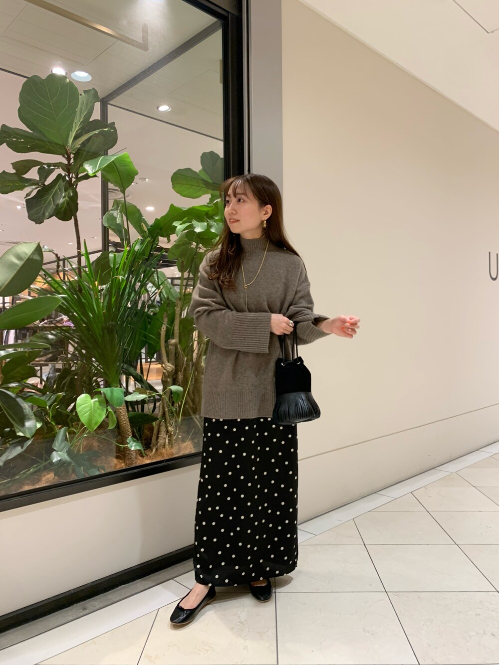 毎年人気のYAKウールのニットは、 着心地がとても良く長く愛用頂けるニットです! 着映えするドット柄のスカートと合わせました。