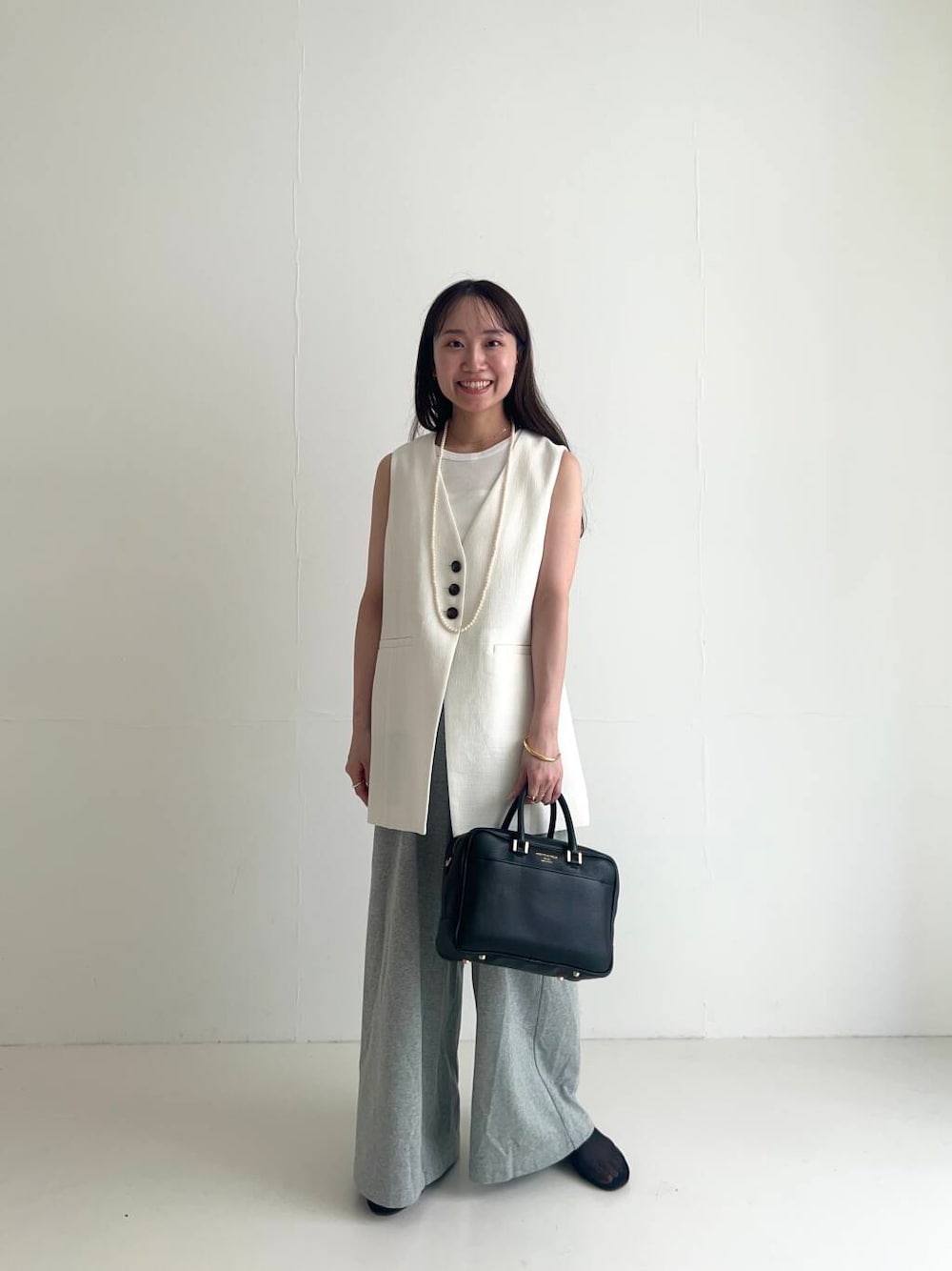 〈ジレ〉 少し着丈が長めのデザインとウエストが少しくびれるようなラインがきれいで着るだけで上品なコーデに仕上がります。 〈パンツ〉 生地がとにかく軽くて着心地が良いです! 着用は38サイズで大きいですが、36サイズなら スニーカーなどでも履けます。 トレンドのスウェットライクなパンツコーデも これならボリュームも無くてワイドなシルエットが大人っぽく、きれいめにも合しやすいです! WEARE:@urmnm Instagram:@l_mnms