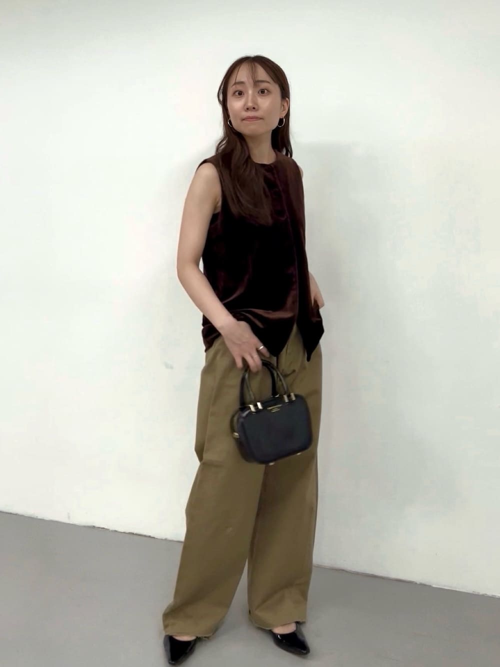 〈ジレ〉 シーズンムード高まるベロア素材のジレは、 まだ暑い時期は、ノースリーブのりまま着ても可愛いです。季節が進んだら長袖とレイヤードしても◯ ウエストラインがきれいで女性らしさがあってかわいいです。 〈パンツ〉 シンプルなトップスでも着映えするカーブシルエットのパンツです。裾はしっかり長さがあるくらいがかわいいです!