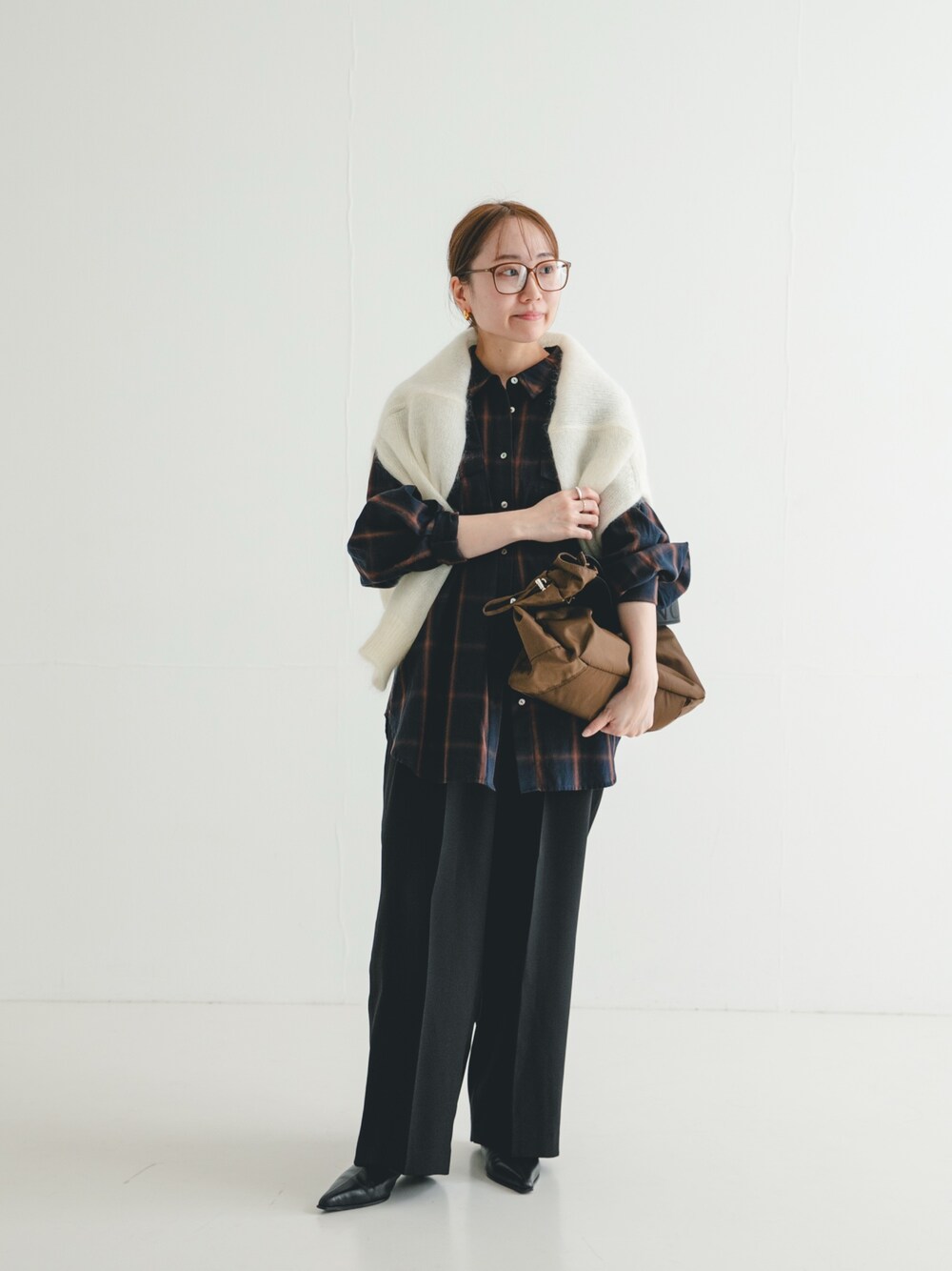 ・シャツ 柔らかいチェックが特徴のオンブレーチェック柄 派手にならないのでコーディネートに取り入れやすく 似合いやすいです! 柔らかい落ち感のある生地なので体に添いやすく 着こなしやすいです。 ・パンツ 38着用でかなりハイウエストで履いてます。 私の身長くらいだと36サイズがおすすめ。 ウエストゴムでかなり楽ちんですが、シルエットとキュプラのツヤ感がきれい目します。