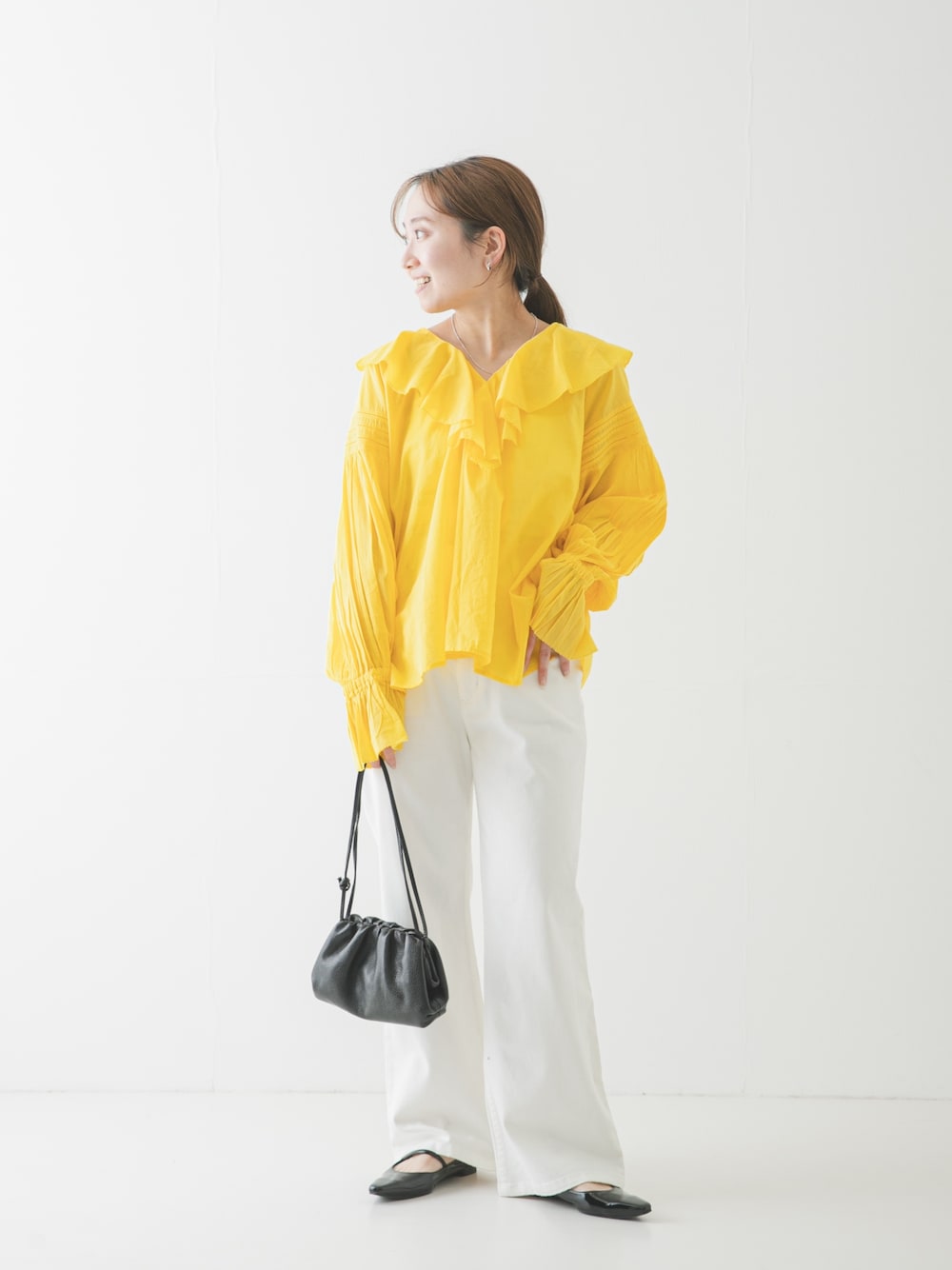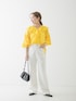 ・ブラウス 毎年人気のコットンのブラウス。 軽やかな生地感が初夏まで涼しすく着れます。 ふわっと軽やかな感じとフリルデザインが女性らしくて、着映えします。 コットン生地なので意外と甘くならないので 大人の女性におすすめです。 袖口にゴムが入っているので、2枚目のように まくって袖にボリュームを持たせるのも◎ ・デニム 夏場も快適に着れるデニムです! デニムと思えないほどストレッチ、軽さがあって ストレスフリーです。 麻が入っていますが、チクチク感は無いです◎ 38でルーズな着用感。 36だとよりスッキリジャストで履けました。