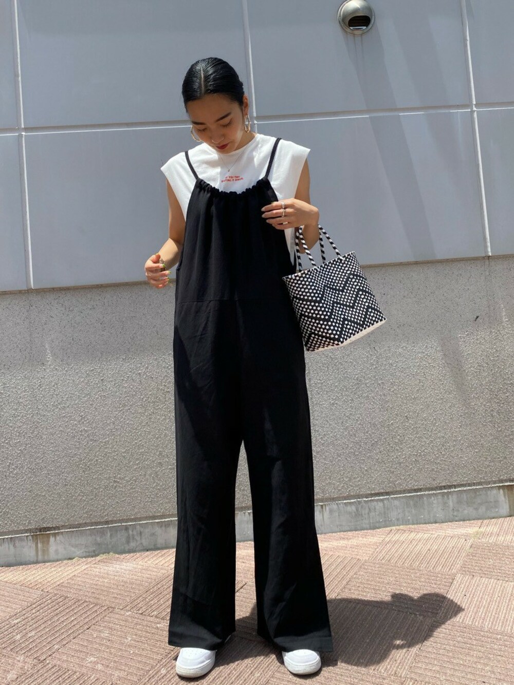 モノトーンシンプルコーデにロゴTEEを合わせた遊び心あるコーデです!! サロペットから見えるチャイナロゴのバックプリントがとても可愛いです◎ サロペットはロープの長さ調節が可能なので、 丈感もちょうどよく着ていただけます!!