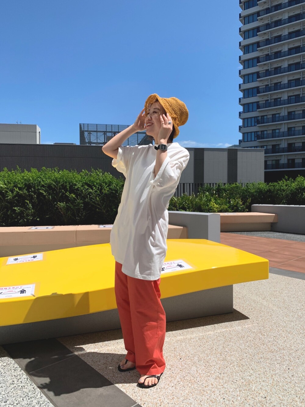 久しぶりにこんな天気が良くてテンション上がってます! 晴れた日に着るカラーパンツ最高です。 KBFのBIG TEEはワイドパンツやスカートに合わせてゆるってきてもgood