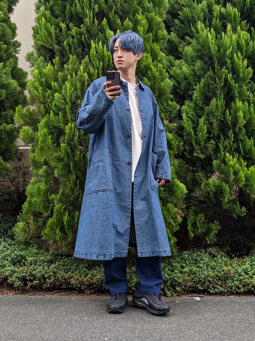 Toru (warehouse 那須ガーデンアウトレット)のステンカラーコート「スラブデニム バルマカーンオーバーコート」を使ったコーディネート