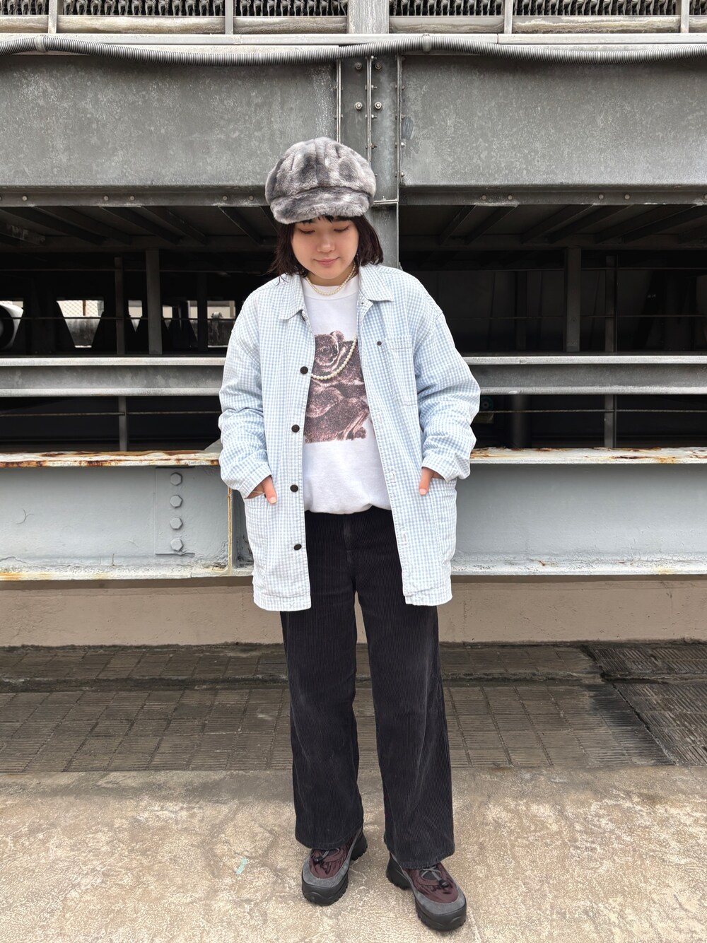 モコモコ素材がかわいい、フェイクファーのキャスケット。 小ぶりで形を整える必要もなく、サッとかぶれます😊 ツバを後ろにしてベレー帽風に使うのもおすすめ! [コーデのポイント] 帽子が主役のコーデではありますが、頭だけに重心がいかないよう、ダボっとサイズのカバーオールでバランスをとってみました!