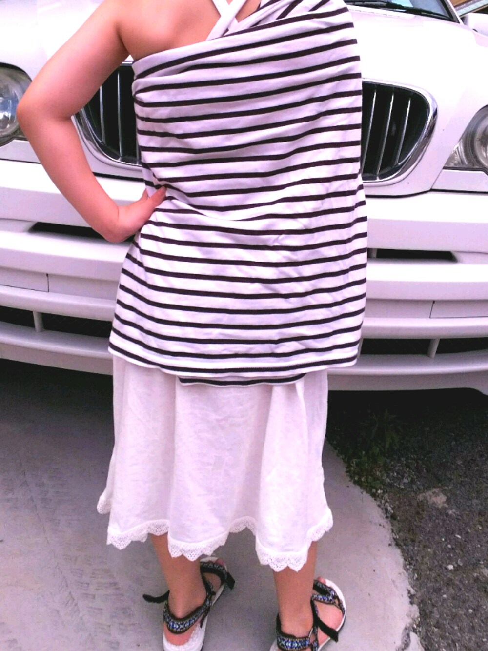 後ろ姿🤗 ただの ロンT まいて ホワイトワンピの シンプルを消し 透け感も なくしました🎵❤️