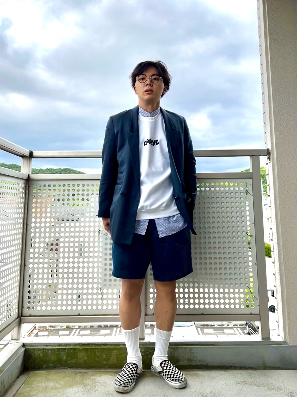 もう暑いかも… ジャケットとハーフパンツのセットアップは結構好きでして、長めの靴下もあえて履きたい。あとジャケットとロゴスウェットの相性もいい。 トラッド感出たかな?