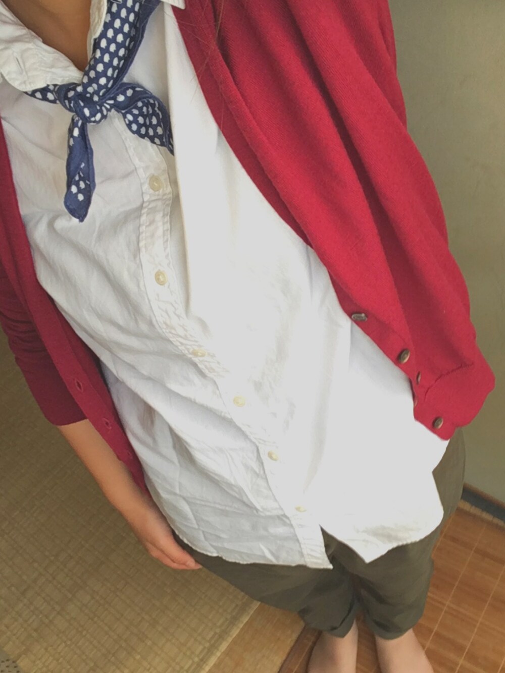 普段着。家の中でどこいった〜と探してた白シャツが見つかったのでこれでコーデしてみた。しかし肌寒いのでカーディガンを羽織った次第です。笑