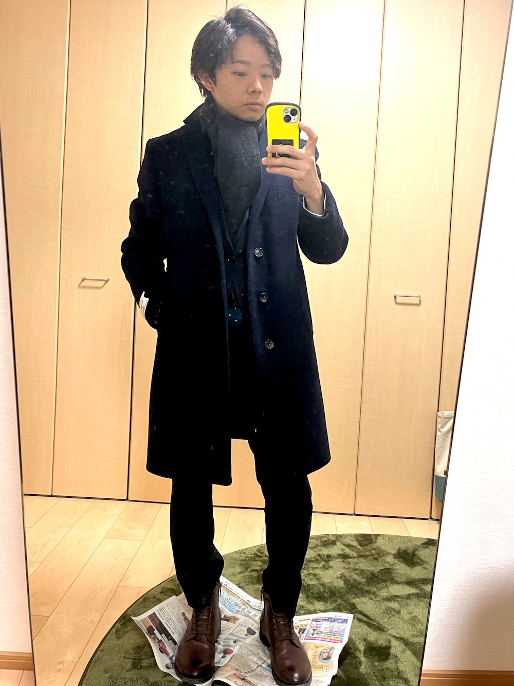 テーマ 「スーツできっちり」 チェスターコートは綺麗にみえる。 スーツの時はこのマフラーの巻き方 いいねフォローお願いします🤲