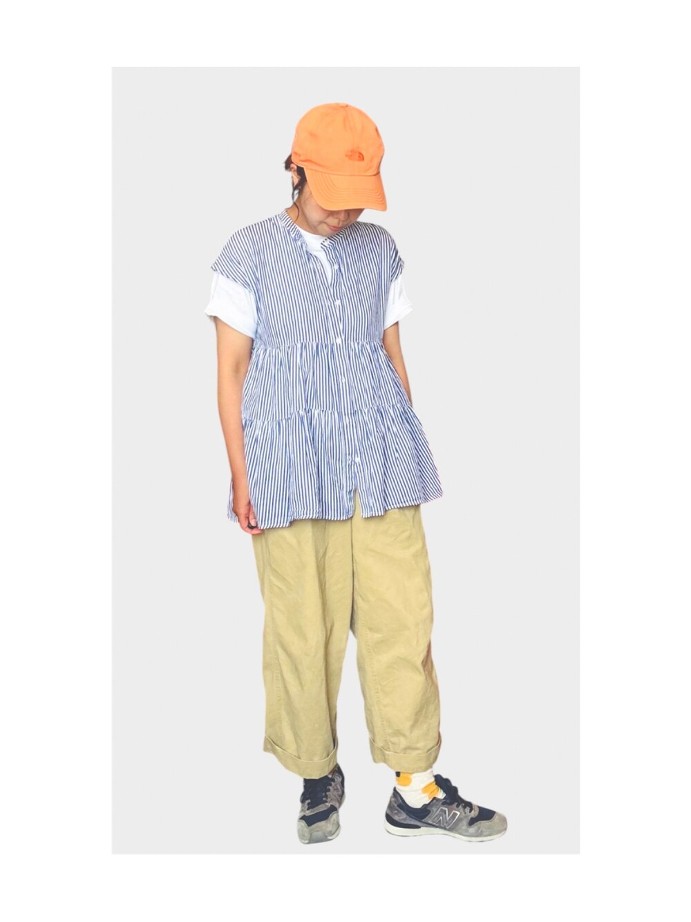 ペールオレンジのキャップにストライプ合わせがお気に入り❤️ Right-onで購入したBEEFYのTシャツは生地がしっかりしていて素晴らしい! ゆるパン合わせで、何年経っても好きなコーデです。