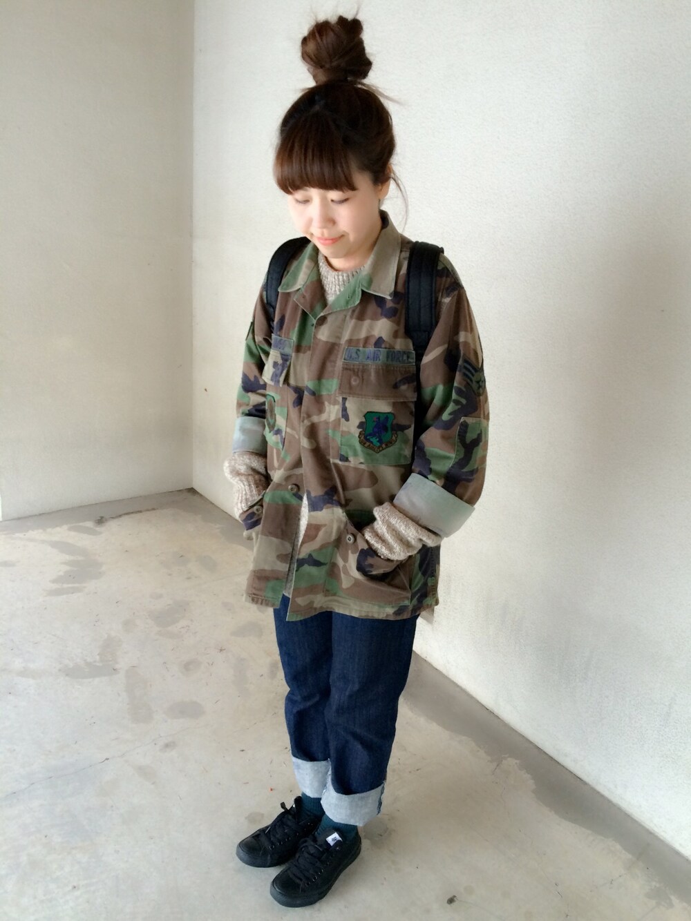 アウター used ニット used リュック PORTER デニムパンツ BEAMS BOY 靴下 UNIQLO 明けです。旅行の買い出しへ♡ 楽しみすぎる〜(>_<)! ロールアップは太めが好きです。