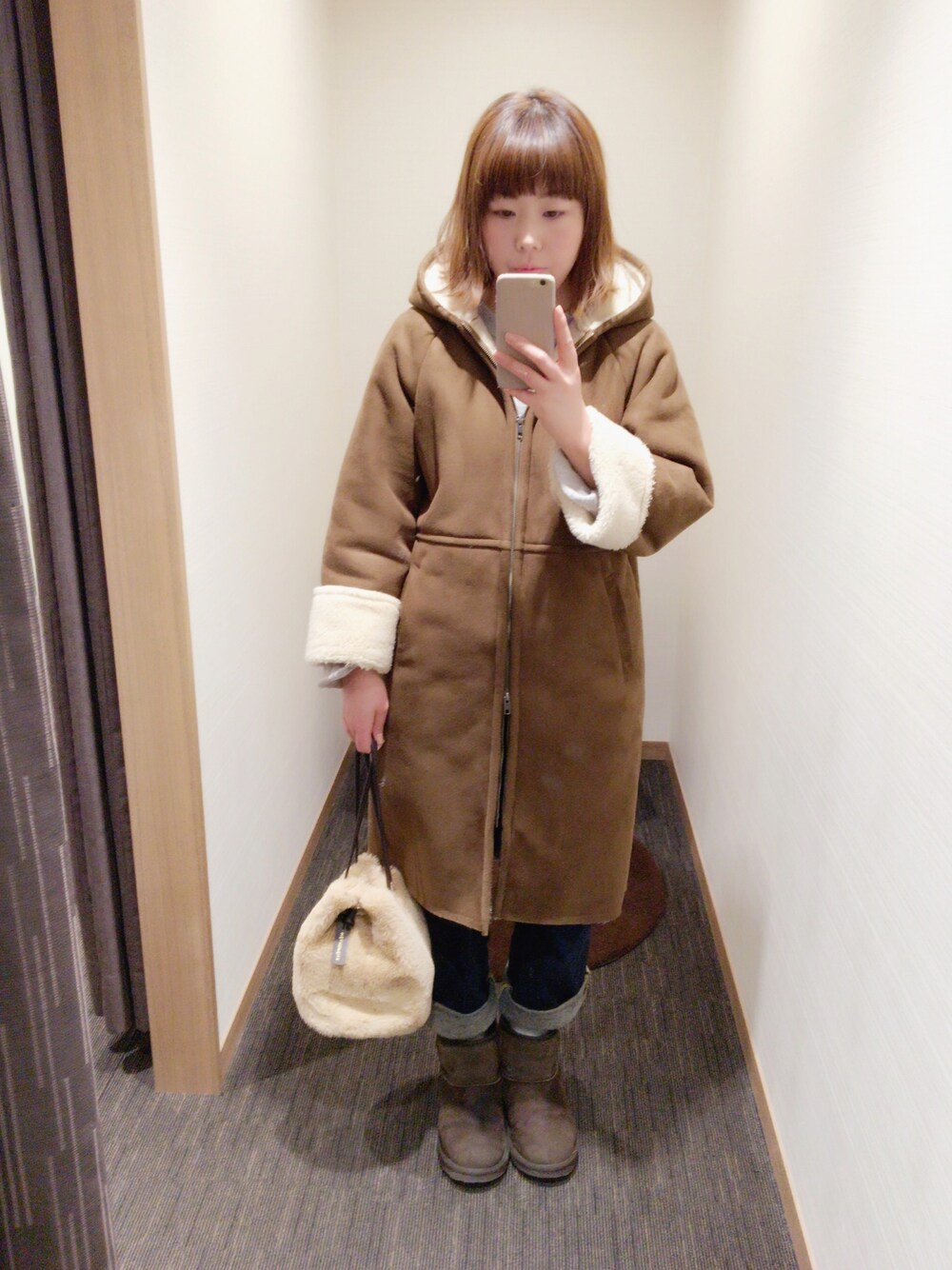 お久しぶりです! KBFのコートはあったか\(^o^)/ ムートン系でフード付いてるところが好きです。 リンネルの付録のファーバッグ、、肌触りが素敵!