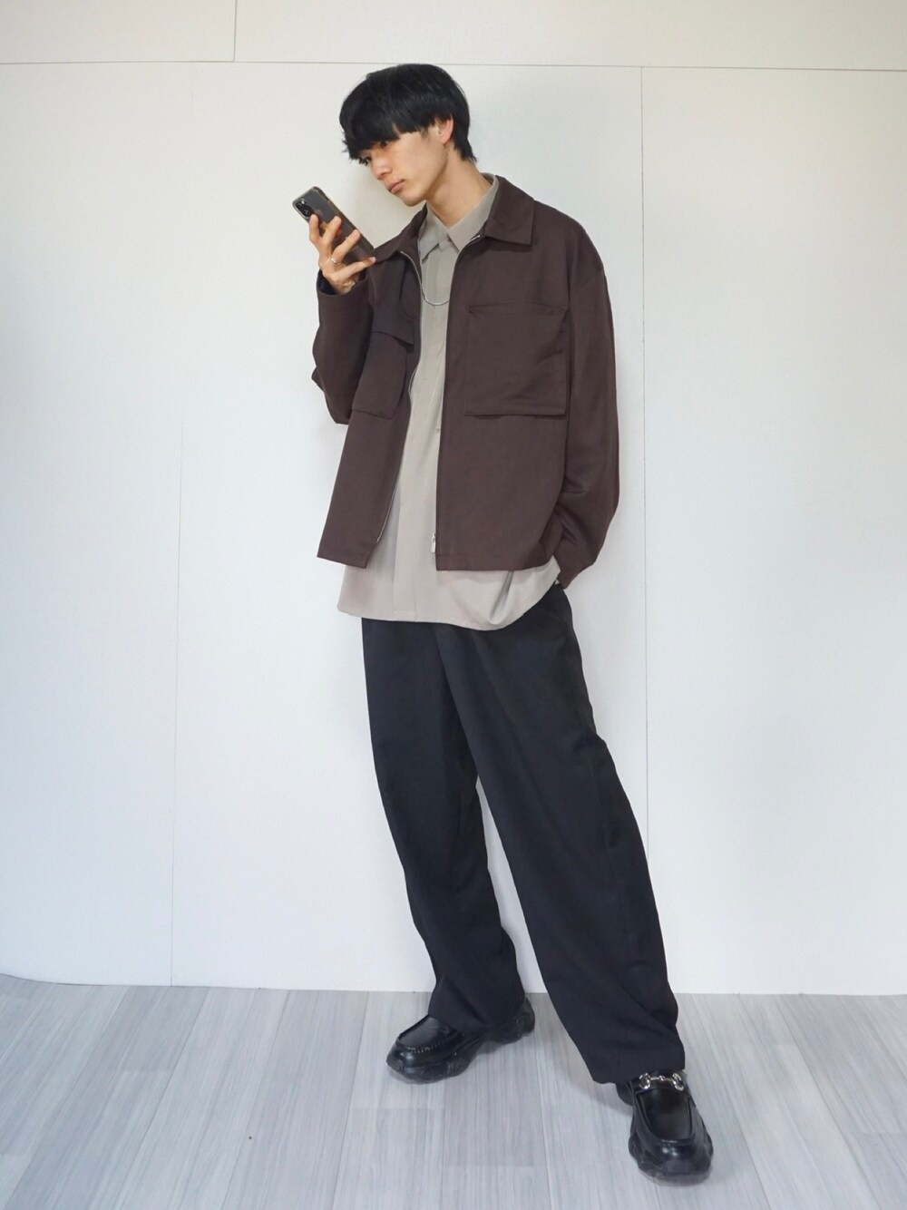 uchiのセットアップ「【セットアップ】TRストレッチ スーツ地 オーバーサイズ CPOジャケット & ワイドパンツ」を使ったコーディネート