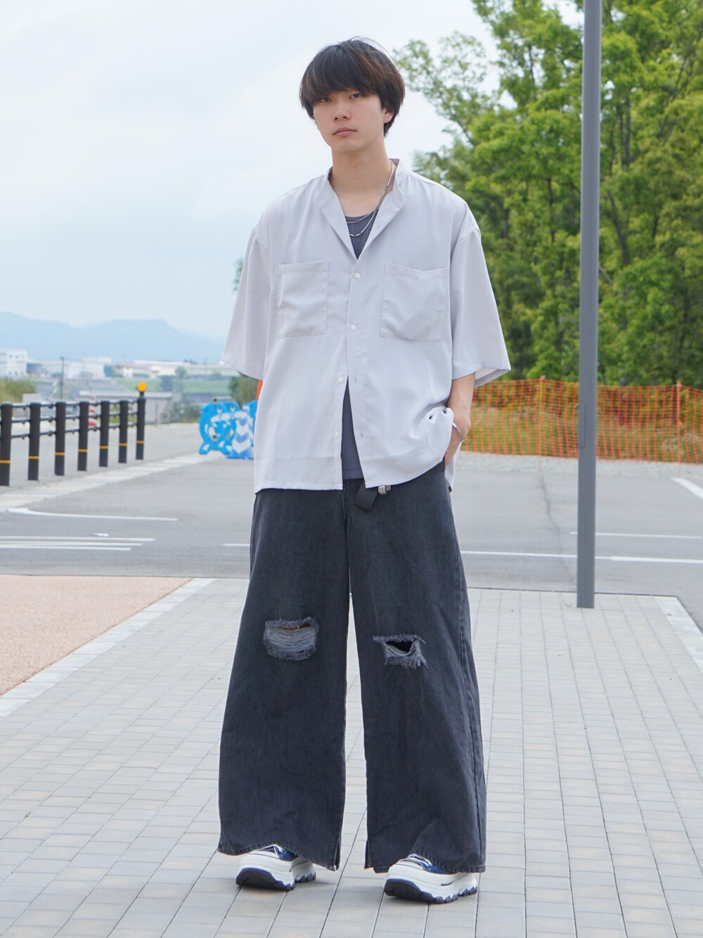 バンドカラーシャツを着崩してカッチリしすぎないようにするのと、ダメージデニムでカジュアル感をプラスしたスタイル. デートにおすすめなスタイリングです! 足元もスニーカーでカジュアルめに!