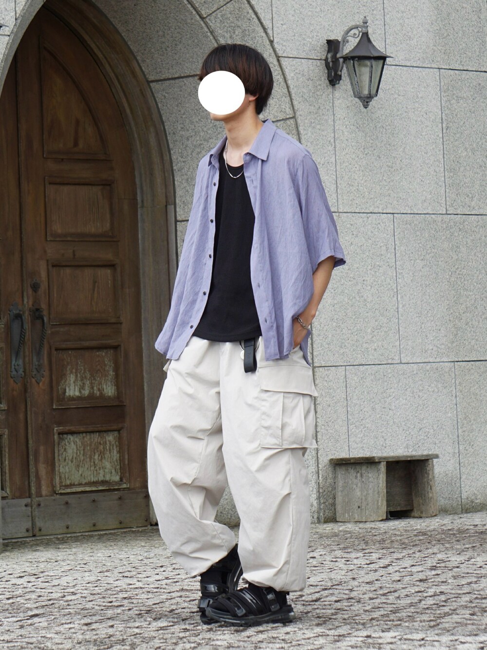 カジュアルめなスタイリングだけど、モノトーンできれいめな印象に! 夏の色合わせで、パープル×モノトーンはおすすめです!