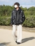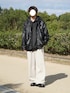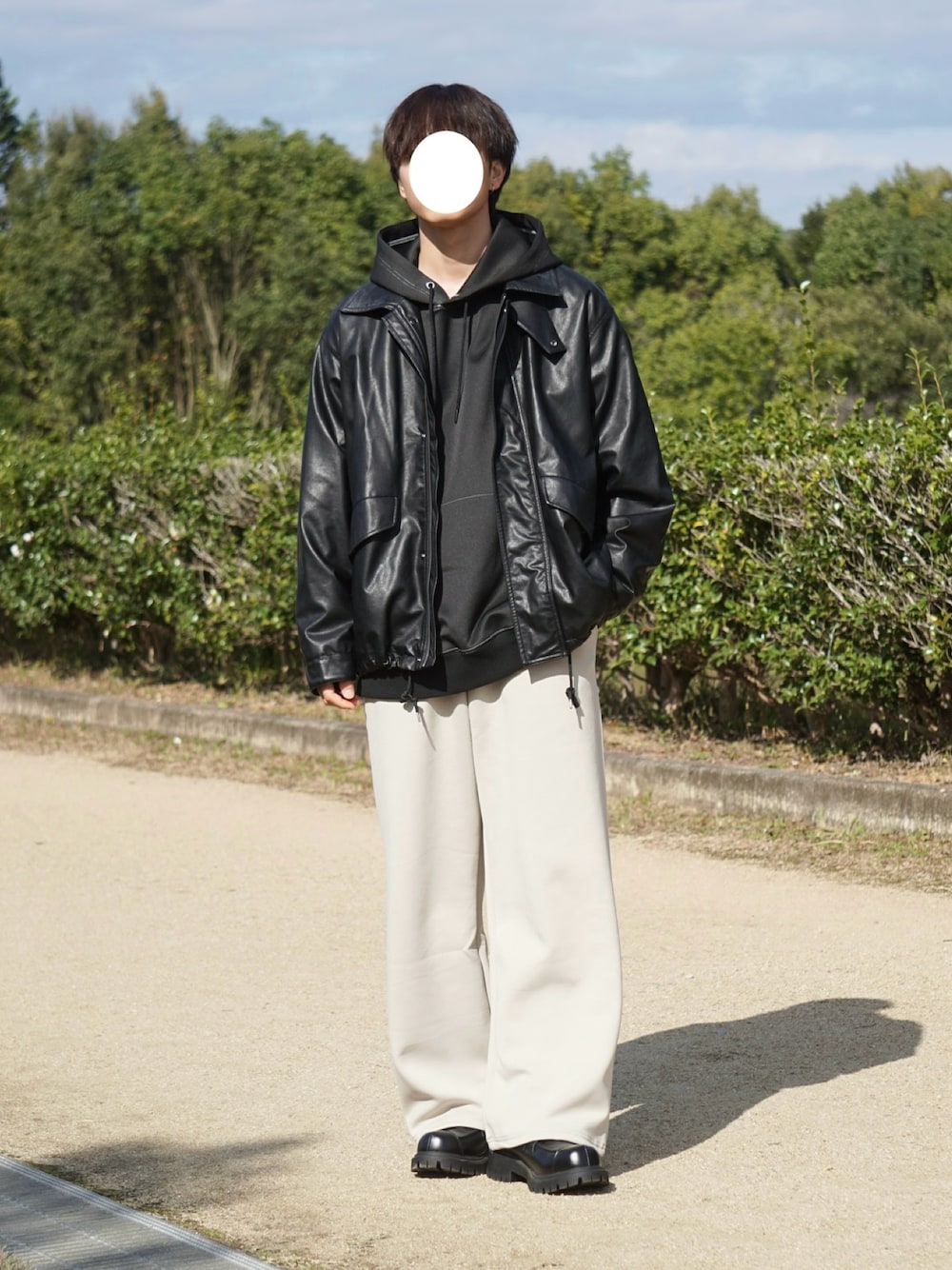 UNIQLOのスウェットパンツを使ったきれいめコーデ. レザーでかっこよさとスウェットとゆる感をミックスさせたスタイルです!