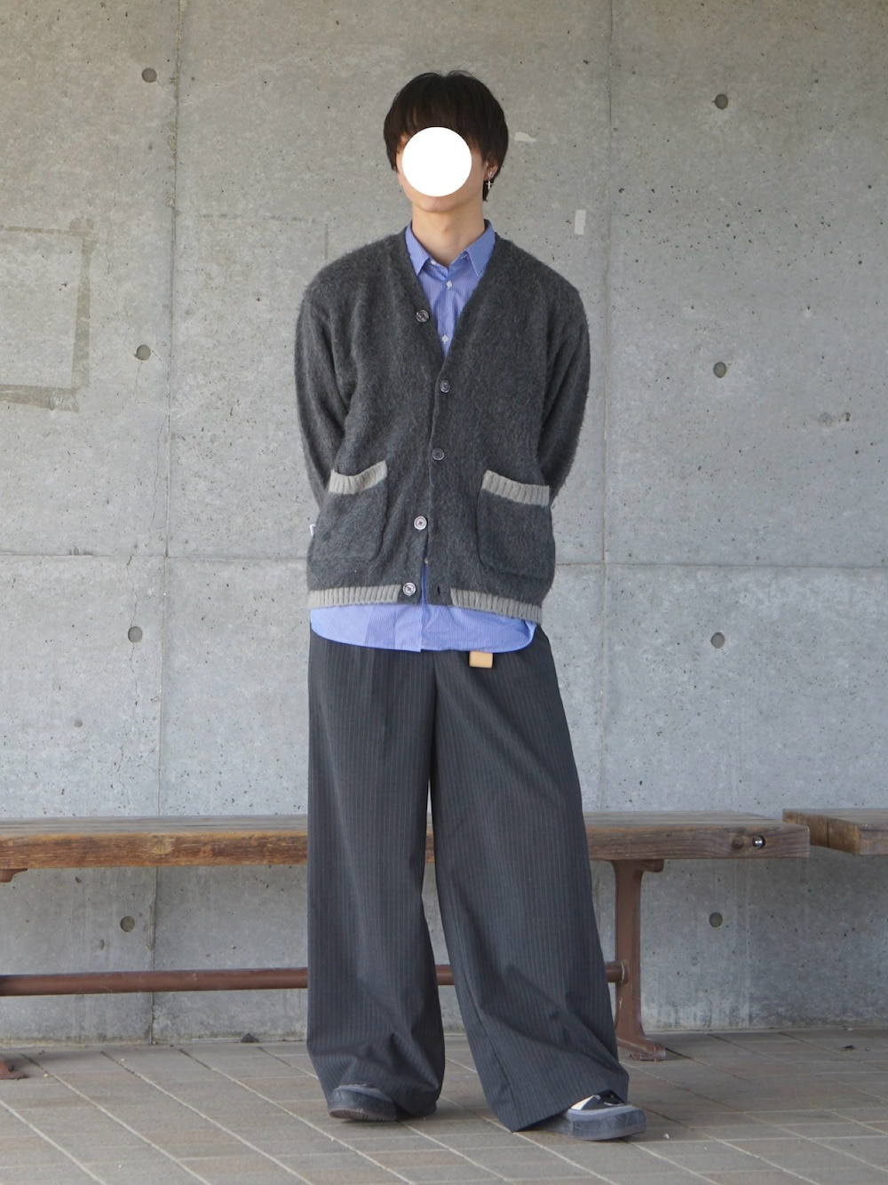カーディガンとスラックスの大人コーデ! 春らしく青系のシャツを選びました👔