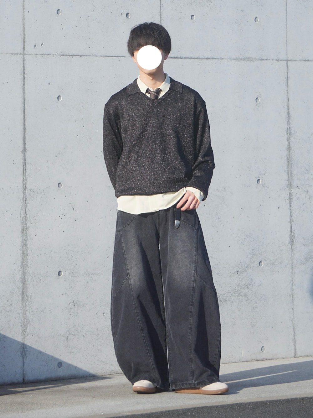 黒ニット × シャツ × ネクタイで上半身はきれいめにまとめて、下はワイドデニムで一気にモード&ストリート感を!👀 シャツの裾出しレイヤードがおしゃ見えポイント🔥