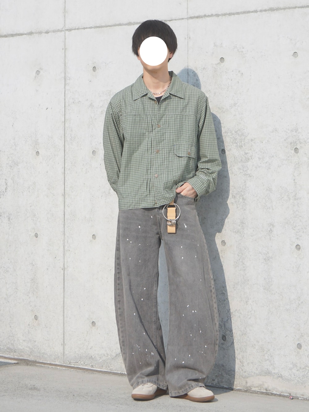 くすみグリーンのチェックシャツで柔らかさを出しつつ、ワイドなグレーデニムでラフな抜け感をプラス!👀 小物のキーリングでさりげなくアクセントを効かせた、今っぽいバランスのコーデ🔥