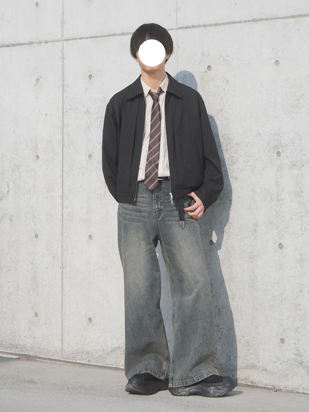 ブラックのブルゾンにシャツ×ネクタイを合わせたキレイめベースに、ワイドデニムで一気にストリート感をプラス👀 全体をモノトーン寄りでまとめてるから、ラフなのにどこか上品な印象に仕上がってるのがポイント◎🔥