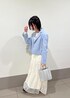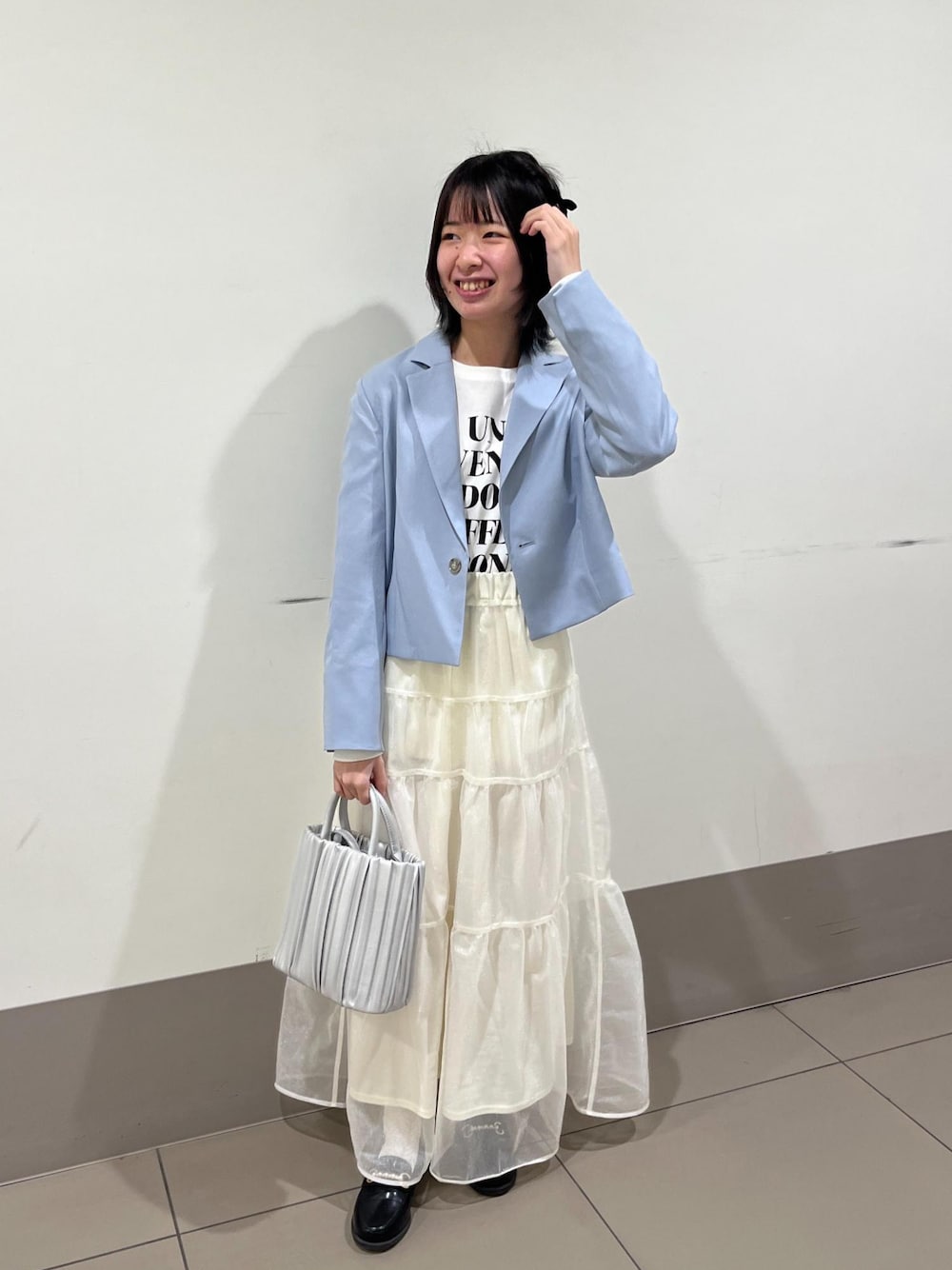 トレンドのショート丈ジャケットに、ふわふわのスカートを合わせてメリハリをつけました◎ ジャケットは淡いブルーなので春らしく爽やかなコーデになりおすすめです!