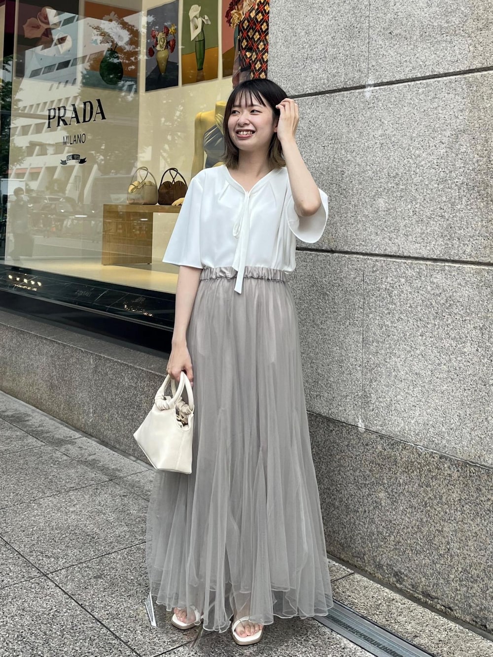 リボンタイ付きのブラウスに、チュールのスカートを合わせてキレイめなコーデにしました◎ ふわっとしたチュールスカートは女性らしい印象になり、お出かけにぴったりです♪
