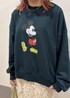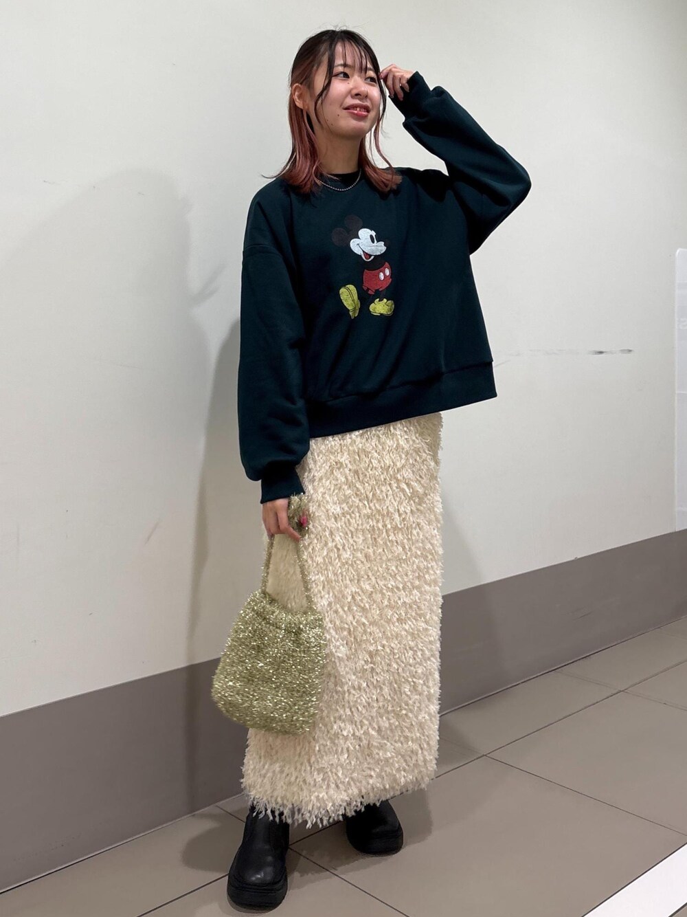 ミッキーデザインのスウェットに、華やかなデザインのスカートを合わせました! スウェットがゆるっとしているのでIラインのスカートを合わせることで、カジュアルすぎないコーデになります!