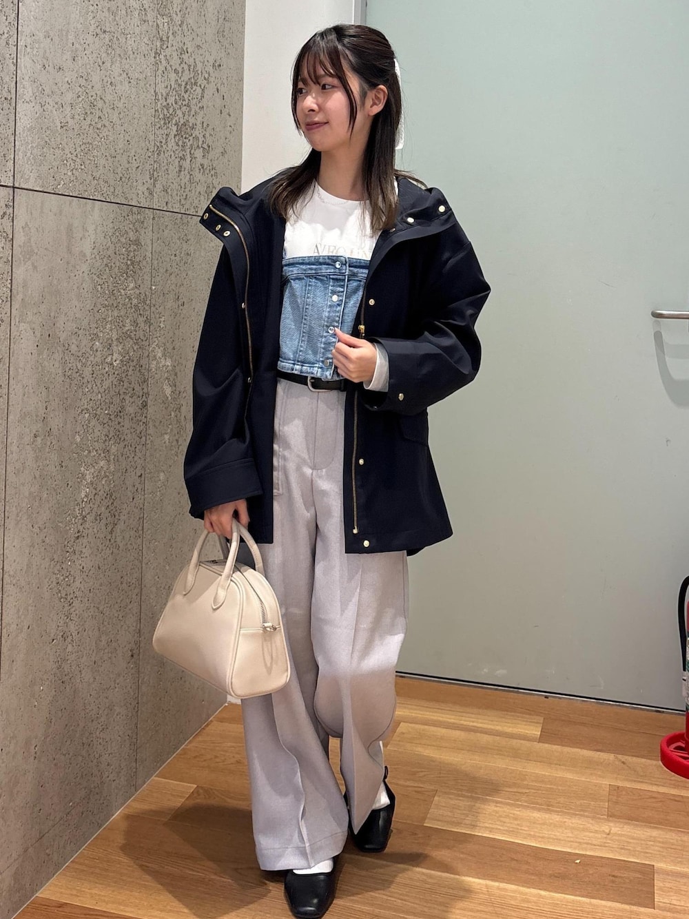 キレイめにもカジュアルにも使えるマウンテンパーカーです! 全体的に淡いカラーでまとめて、マウンテンパーカーで締め色を入れました♪