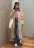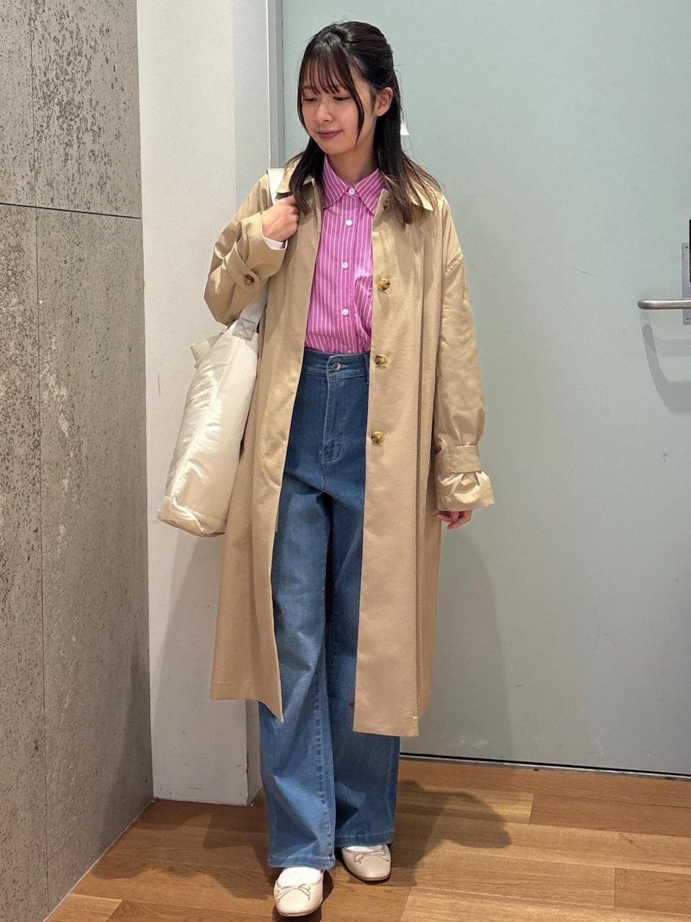 春カラーの濃いめピンクシャツに、ベージュのコートを合わせて春らしいコーデにしました!