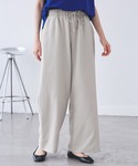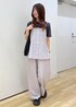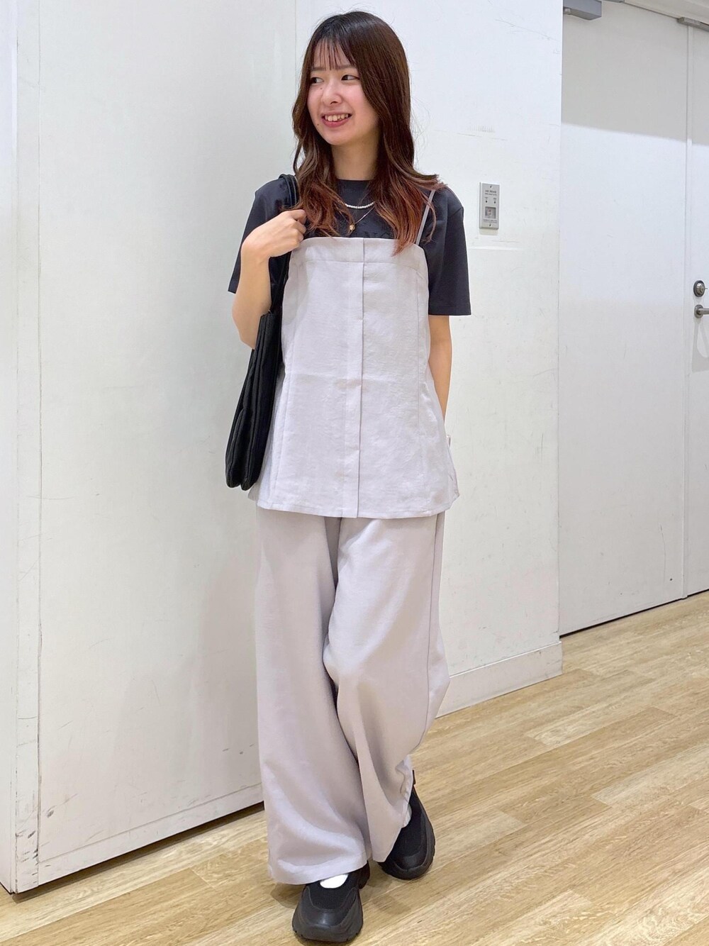 シワにならないシリーズの、ビスチェとパンツでキレイめカジュアルなコーデにしました! ビスチェにTシャツを合わせてもごわつきにくく、オシャレに着用できます◎