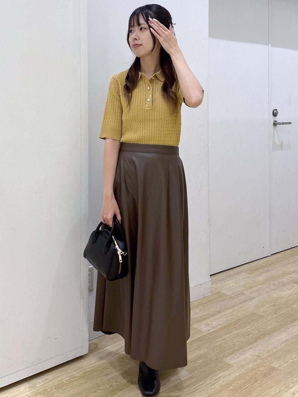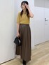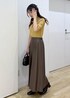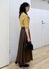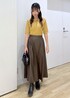 イエローの秋カラーニットに、ブラウンのレザースカートを合わせて秋先取りのカラーコーデにしました! ニットは袖が無く生地感も厚すぎないので、9月中でも快適に着用できます◎
