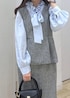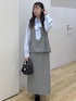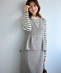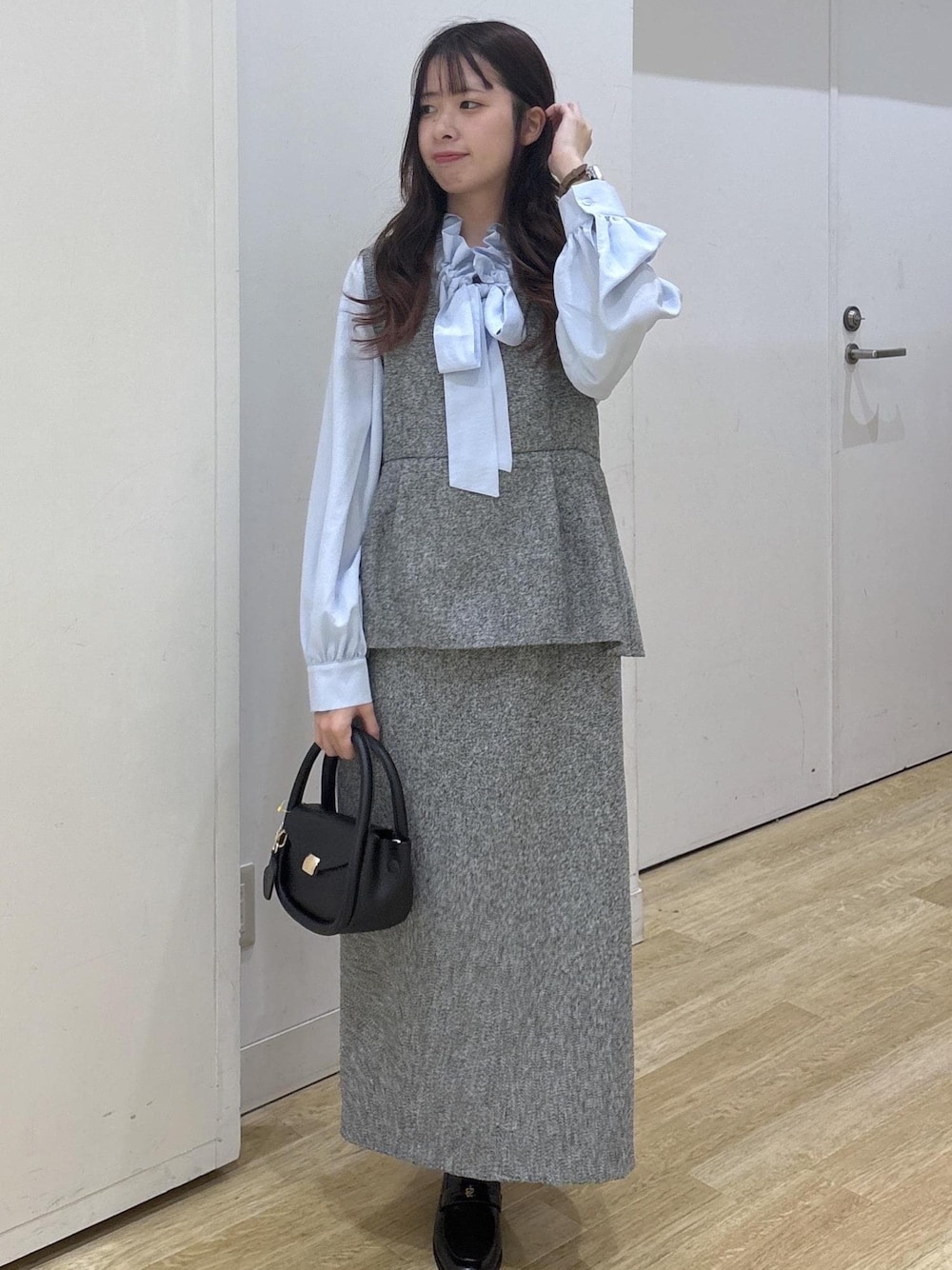 フリルの華やかなデザインブラウスに、セットアップ見えのワンピースを合わせてキレイめなコーデにしました! ワンピースはインナーにタートルネックを合わせると綺麗めすぎないコーデになります◎