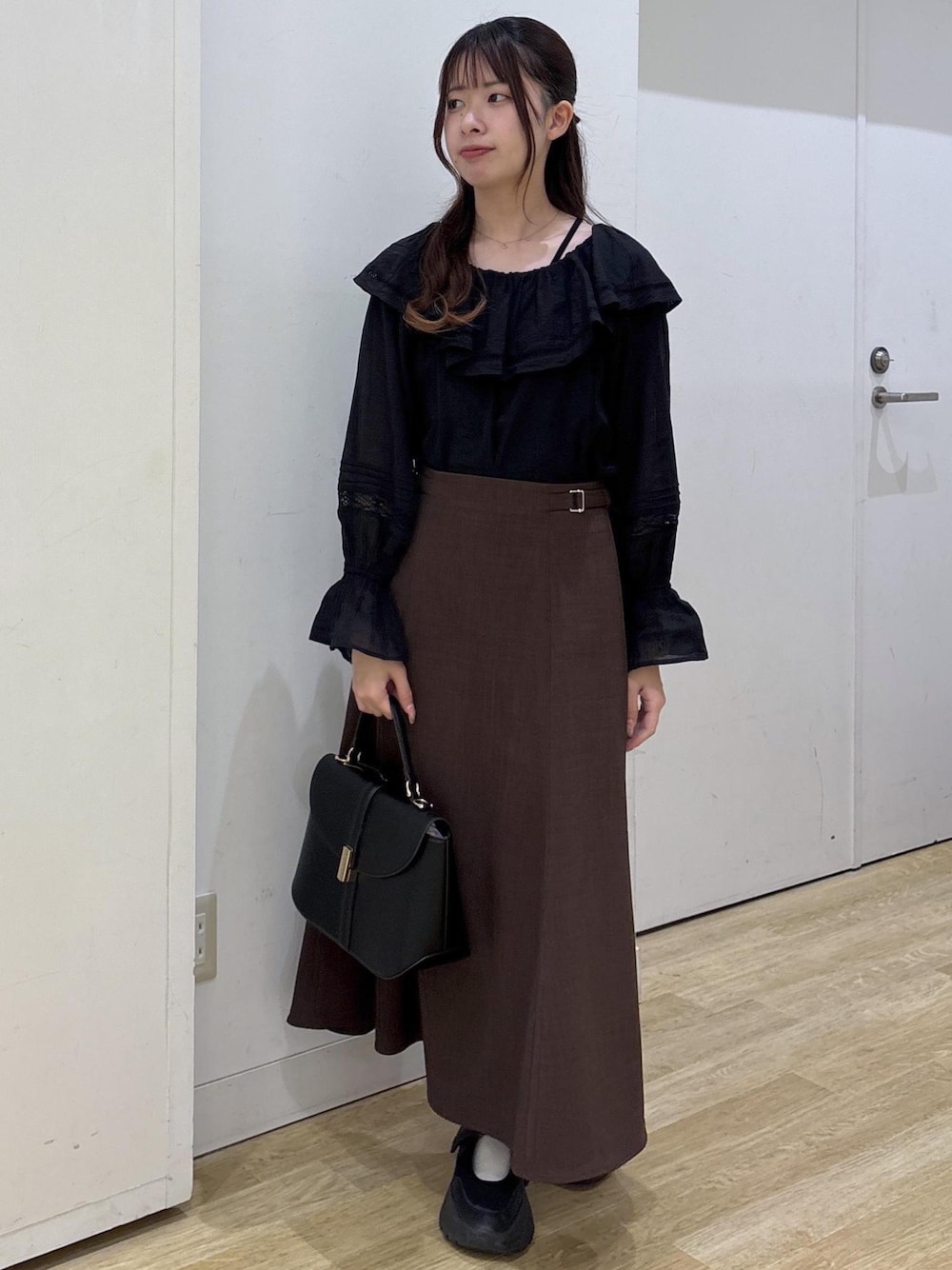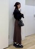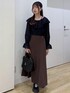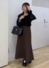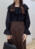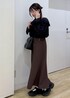 フリルのシャツに、マーメイドシルエットのスカートを合わせてフェミニンなコーデにしました! カラーを落ち着いたカラーにすることで甘くなり過ぎず大人っぽいコーディネートになります◎