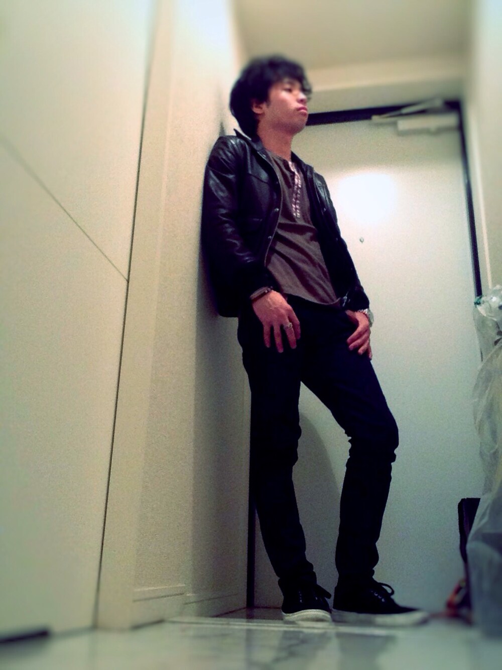 今日はキレイ目のパンツにレザー。 ロックスタイルって奴なのでしょうか?( ̄▽ ̄) スニーカーでカジュアルに。 早く映画のコナンとワイルドスピード が見たいです。