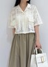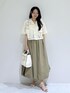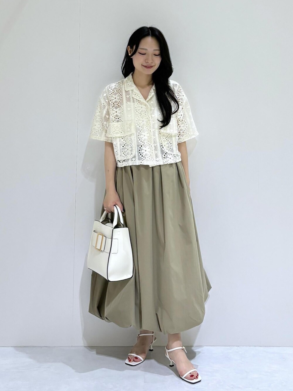 カジュアルなクロシェ編みトップスをバルーンスカートと合わせてフェミニンに♪ 足元は抜け感のあるヒールサンダルでメリハリをつけると◎