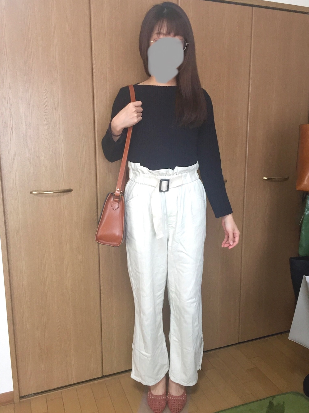 タグをみたので、白パンツしてみましたが、完全にいつもの通勤スタイル。完全に。 そしてバッグ持ってますがどこも行きません。何も入ってません。撮ってすぐ置きます。 このパンツはいくらアイロンしてもくしゃくしゃなので、こういうものだと思ってます。 ウエストがボリュームあるのでタイトなトップスを合わせるのが品があって好きです。 ZARAのパンプスは非常に全部大好きです。カラーはテラコッタです。