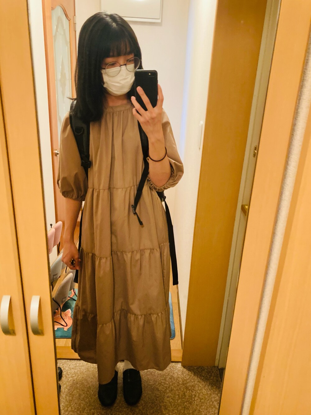 しまむらのワンピースと緑のローファー 急に緑のローファー履いてみるかと思いついたけどなかなか良い。昇格コーデにしよう。 スーパー行ってくる