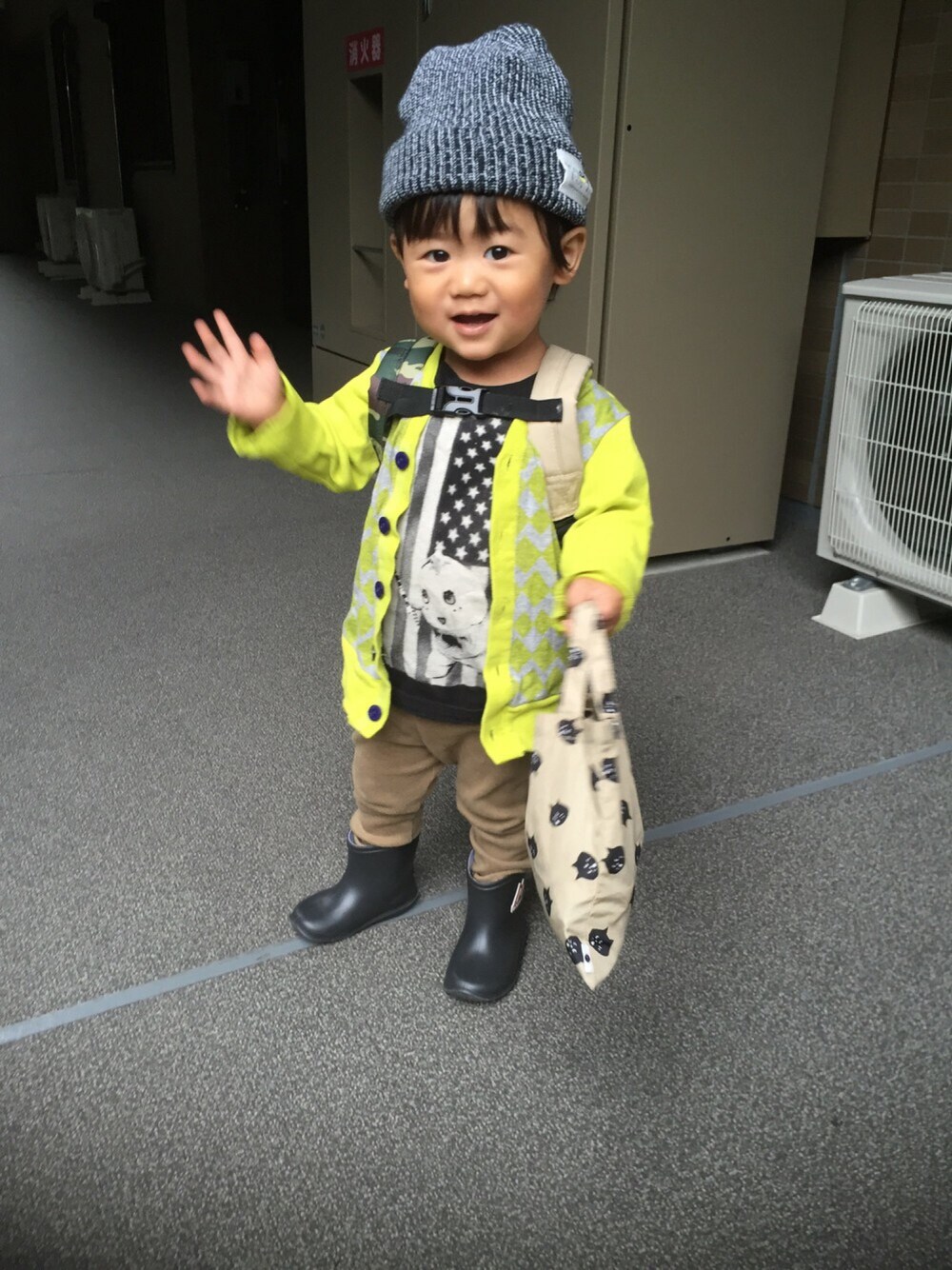 雨の日コーデ☔️ 去年買ったカーディガン小さくなる前に着せたくて😫💦 チビは電車に向かってバイバイしてます👋 電車は見えません😑 でもガタンガタンと音がするとかならず 「あっ‼️」と立ち止まり、見えない電車にバイバイします👋 このまま鉄道に走るのかなぁ🚃