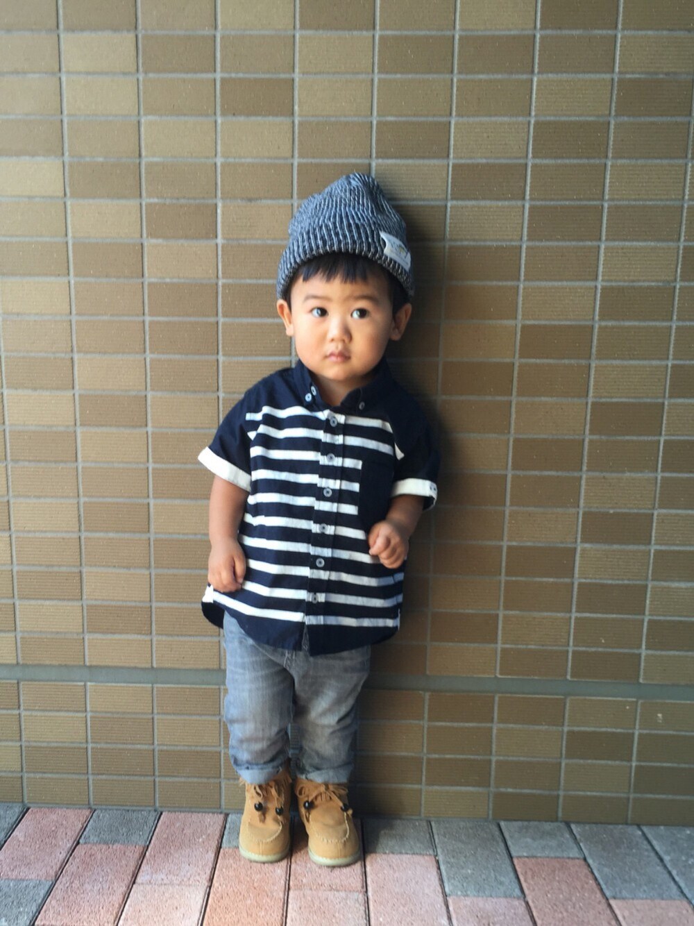 minmiのシャツ/ブラウス「KIDS 綿麻半袖ボーダーBDシャツ」を使ったコーディネート