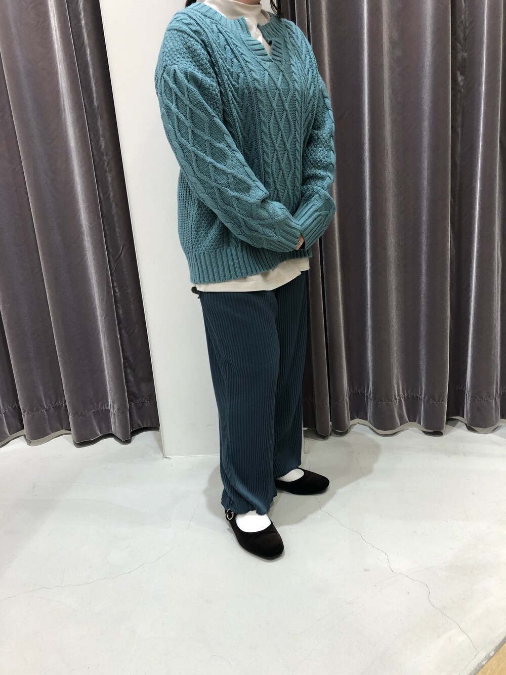 ご覧頂きありがとうございます😊 久しぶりの投稿となります! 今回は冬のブルーコーディネートです(笑) ターコイズブルーの綺麗なお色のケーブルニットが入荷致しました!! 今流行りのレイヤードスタイルにしたくて、グレーがかったホワイトのタートルネックを合わせてみました♪ パンツは細かいプリーツが入っているのでスタイルアップします✨