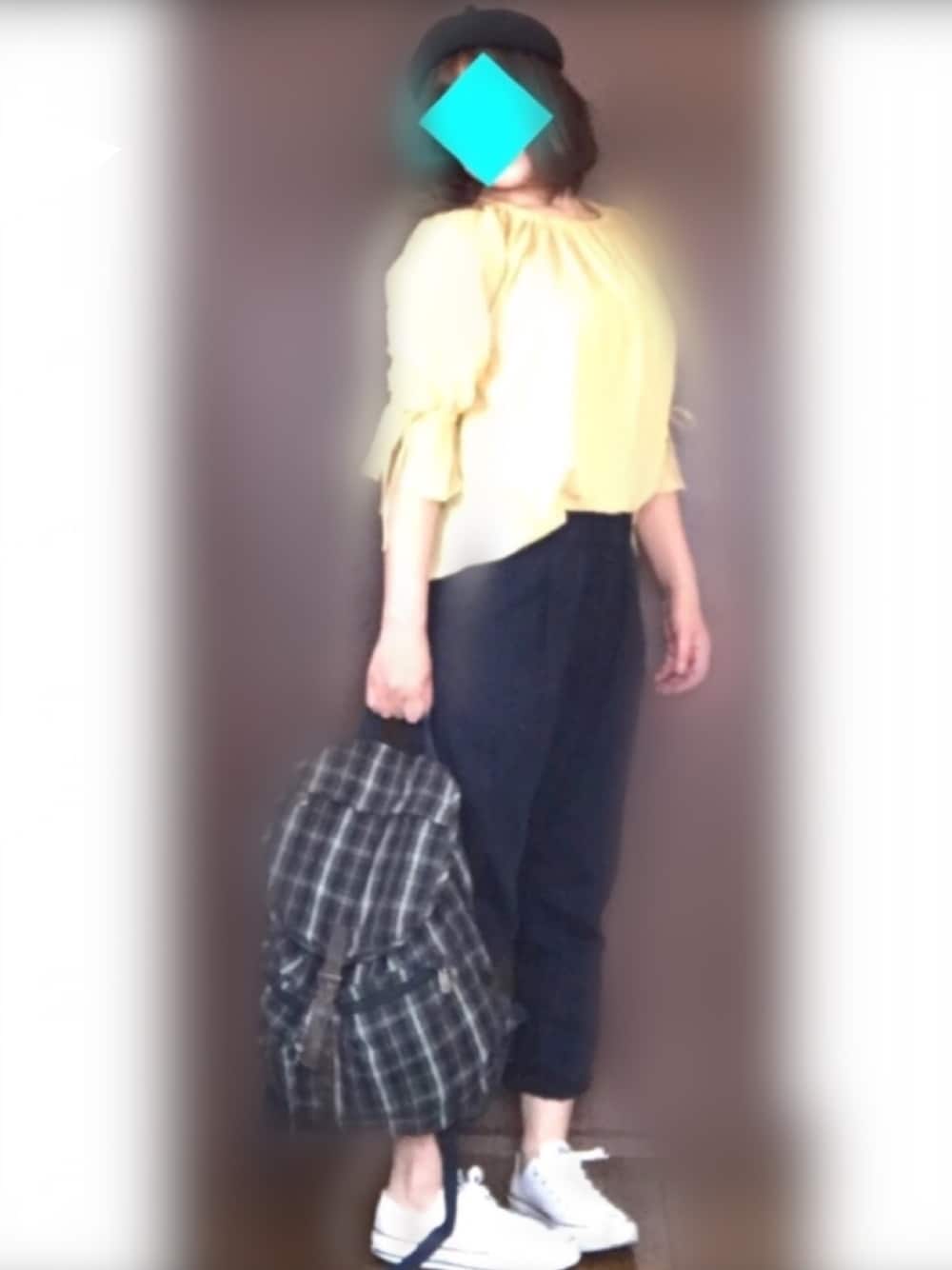 続。。。 黄色のベルトップス着回しコーデ😆 ネイビーのベレー帽を買ったのでネイビーのチノを合わせました♡ ☺︎