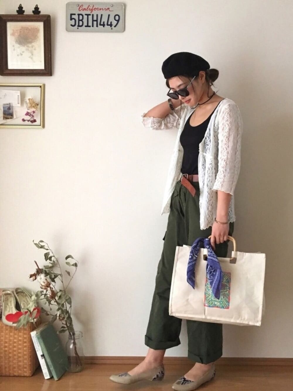 \大人usedコーデ🇺🇸🌵/ こんにちは☺︎ usatasanです🌸 今日は3月3日🍡 ひな祭りですね♩ 桜餅食べるのが楽しみです💓 今日はほとんどusedです🇺🇸🌈 made in USAのタグをみると テンション上がります♡ レースカーディガン..used LAの古着屋 インナー ..UNIQLO ベルト ..used カーゴパンツ ..旦那さんのお下がり パンプス ..geox チョーカー ..handmade ベレー帽 ..rainbow サングラス ..GUCCI バッグ ..used