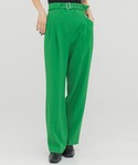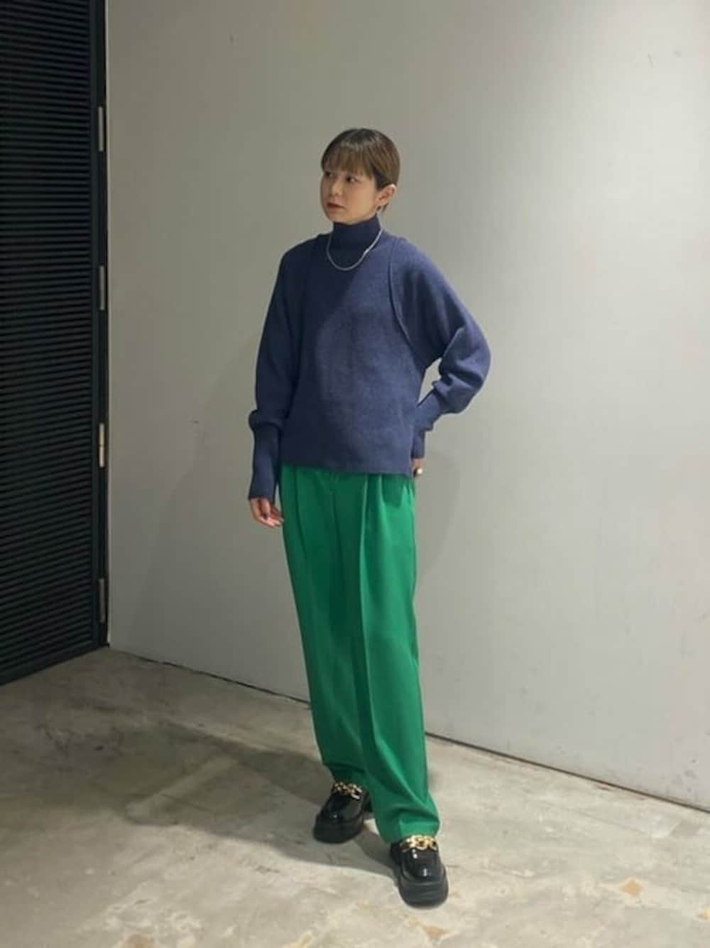 肩周りのデザインがポイントのニットは、丈がやや短めになっているため裾をインしなくても脚長に見せてくれます。パンツはさらっとした肌触りでオールシーズン着て頂けます。ネイビーカラーをあえて鮮やかなグリーンと合わせて、メリハリのあるカラーコーデにしてみました◎