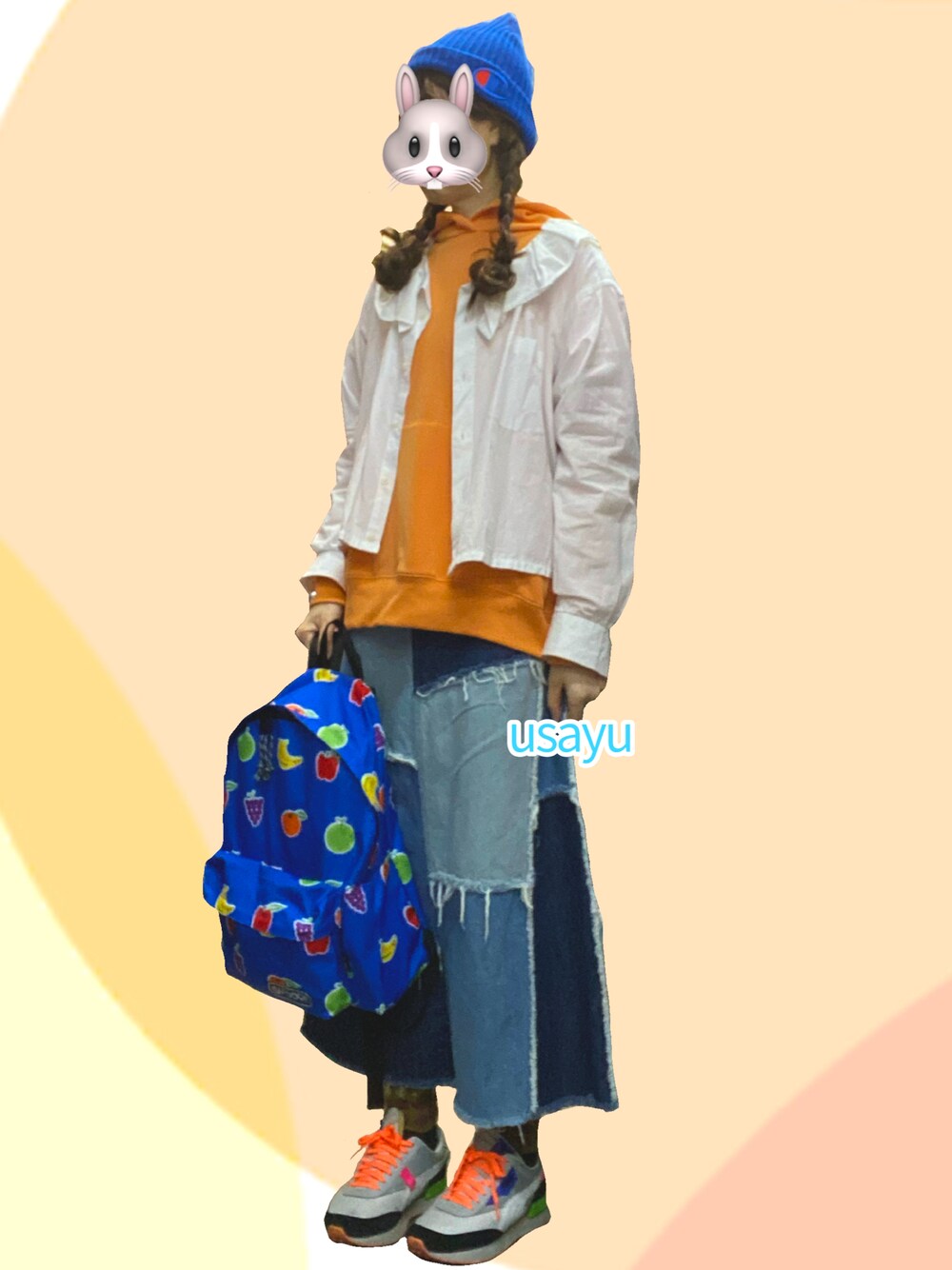 ご覧いただきありがとうございます(*´`)♡ #カラーパレット 3℃ うさオハ🐰💕 寒い中少しだけ春を意識したコーデを…: (´◦ω◦`):さむぅw 🧡💙🤍 このフルーツリュックはバドミントン🏸用に使ってて、 周りにも好評でお気に入りです🐰💕 今の所休止中だから早くまたできる日が来るといいな🎶