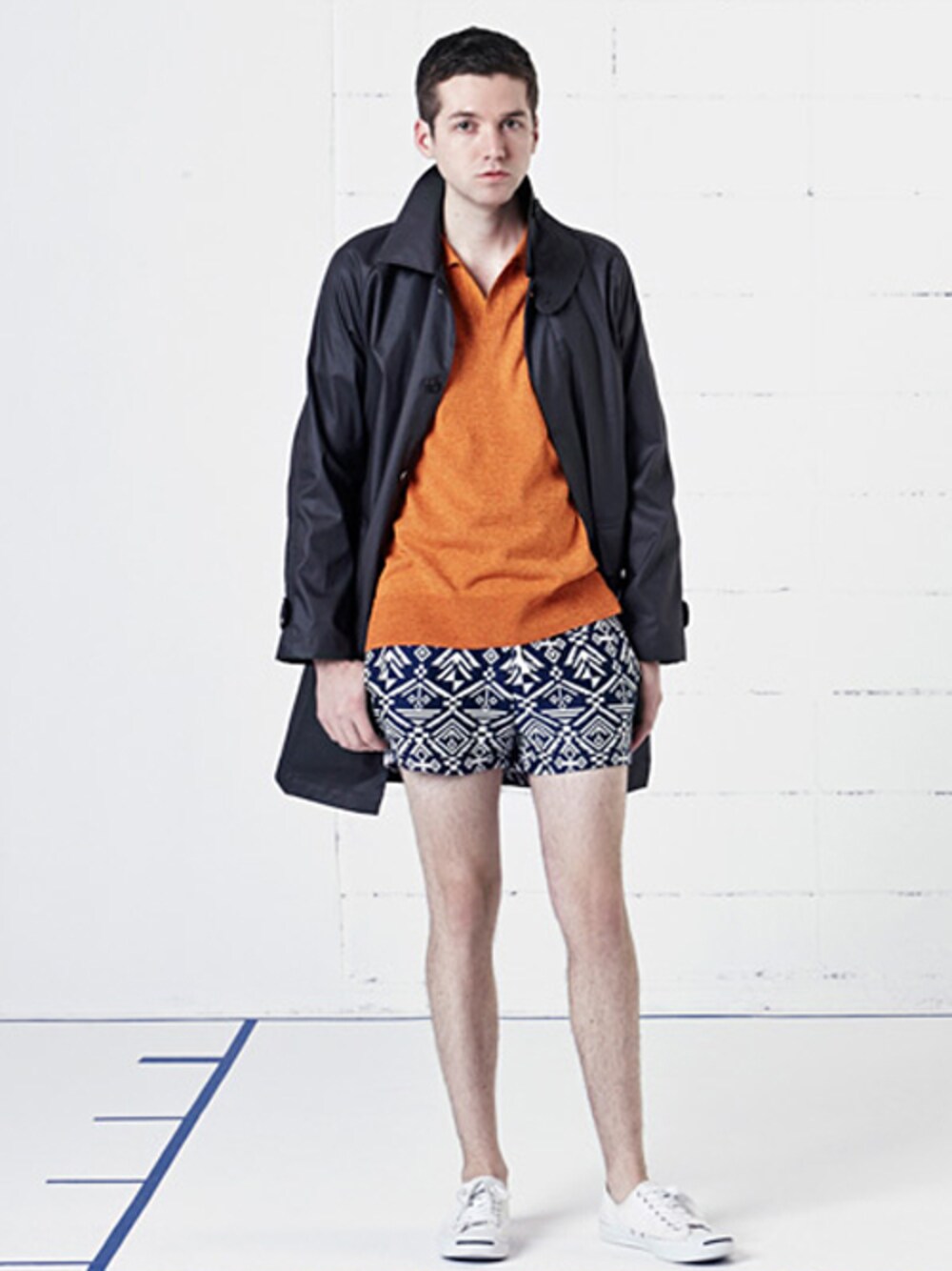 USED FUTURE SPRING SUMMER 2014 LOOKBOOK Waxed Mac Coat with blue piping. Knit polo shirt & Jacquard shorts