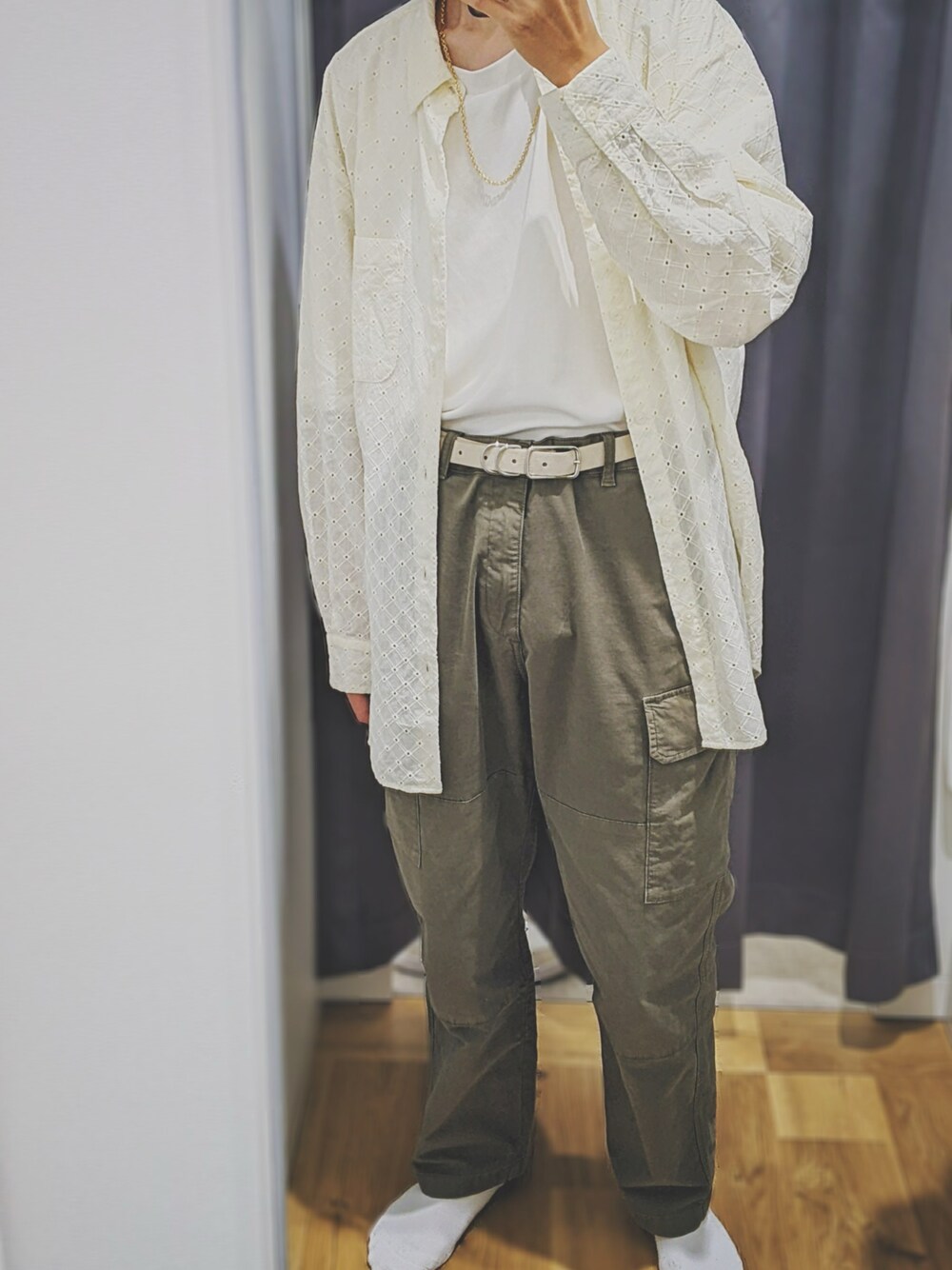先程のコーデのアウターなしverです。 このレースシャツはインナーでも主役でも使えて良いです。 閉めて切ると自分のスタイル的にださくなってしまうので、あえて開けて着るようにしています。 インナーのTシャツはタックインすることで、足長効果を出しています。 白+緑は、爽やかさが出せるなので、個人的に好きな配色です。✨