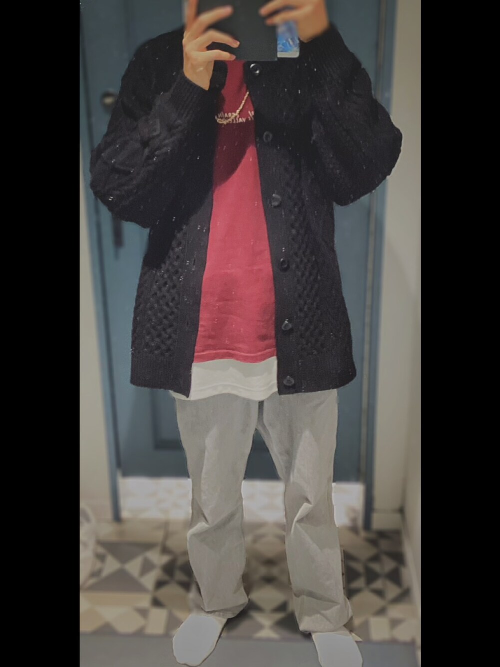 一応主軸がワインTと言う設定なんですが、ボトムスはワインに相性の良いグレーデニムを合わせました。 ワインがそれなりに存在感あるカラーなので、他はモノトーン(と言うかそれしか持ってn…)で合わせました ゴールドネックレスも、黒ともワインとも相性良く、カッコよく合わせられたと思います 追記:タンクトップの丈が少し長く出ているのは多めに見てくださいm(_ _)m 実はこのワインのTシャツ、結構縮だんですよね…皆さん買う時はご注意を⚠️